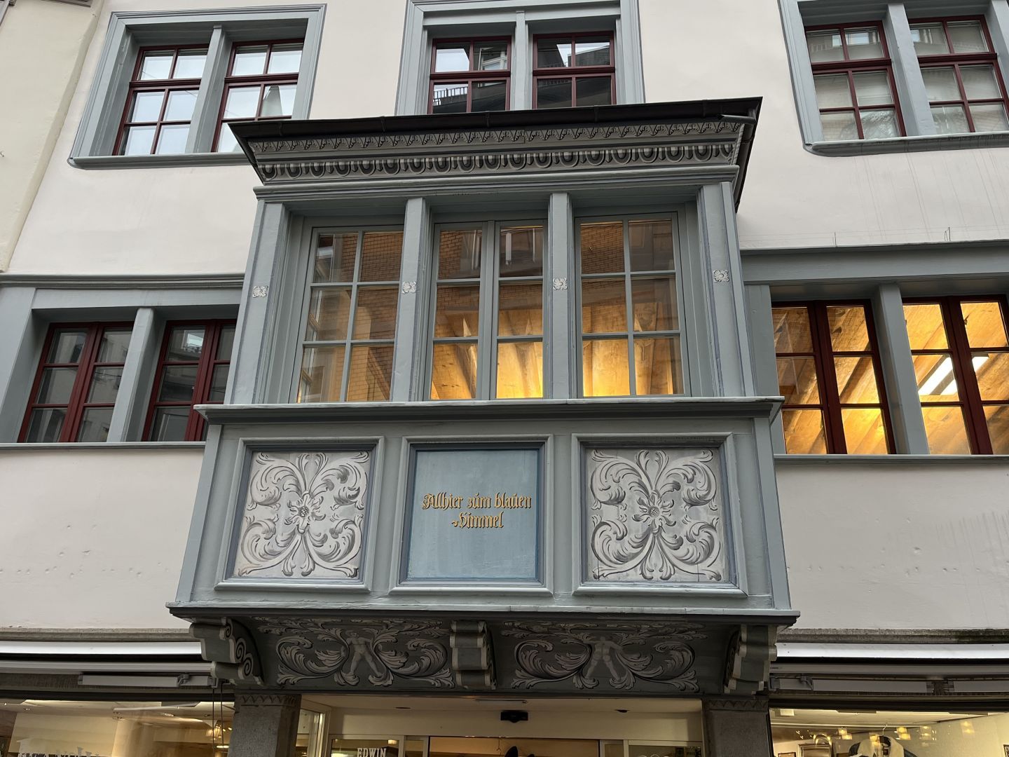 - Teile unter Denkmalschutz (Fassaden, Decken, Holzerker).