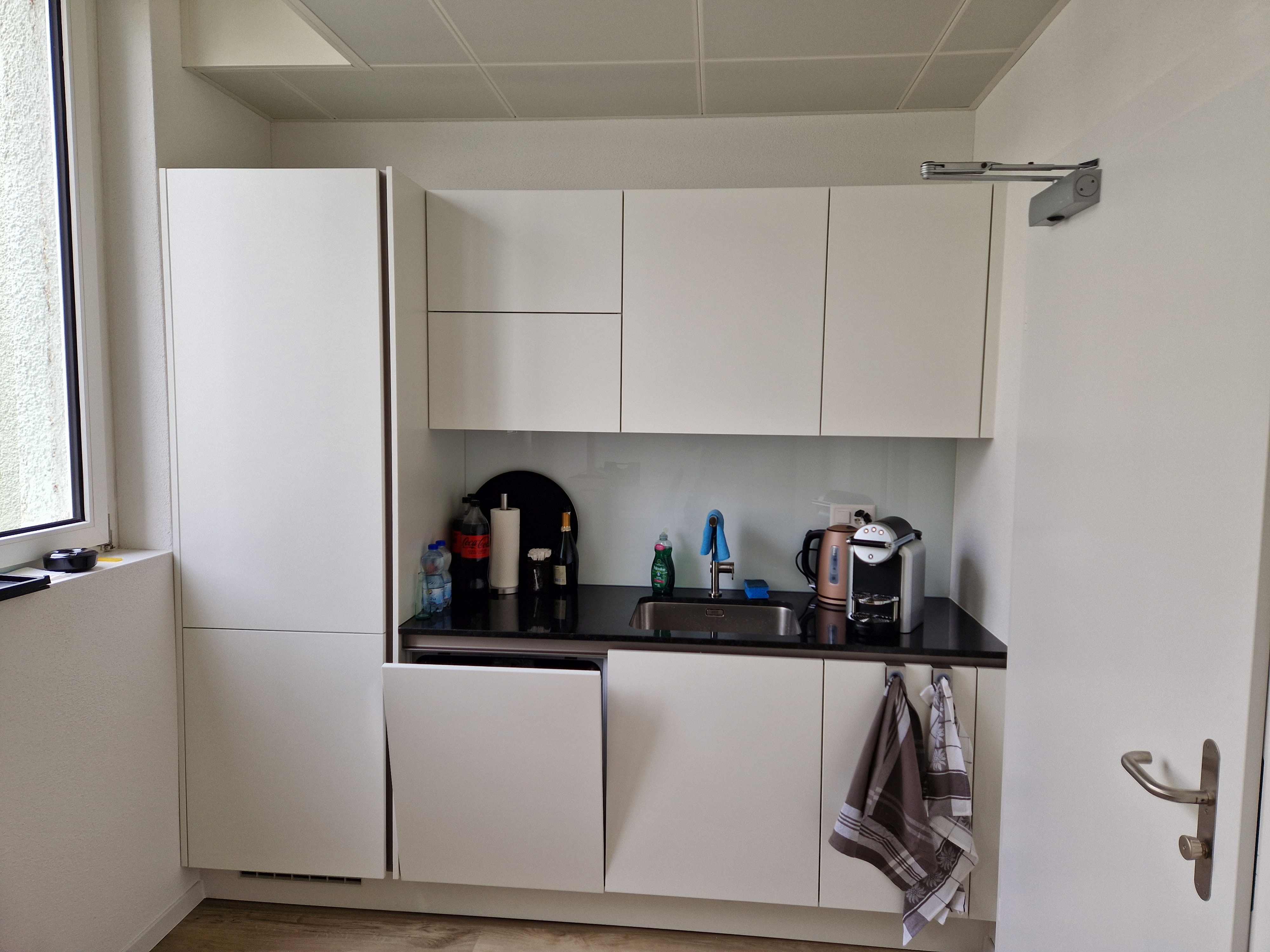 Die Fläche im Erdgeschoss wird für eine moderne Officenutzung ausgebaut. Ausgeführt werden Kugelgarnteppich, Vollabriebwände und ein Metallunterdecken-System, angepasst an die bestehenden Fensterstürze. Die Elektroinstallation wird vollständig erneuert, Heizung und Sanitäranlagen wurden geprüft und – notfalls – instand gesetzt. Eine kleine Einbauküche ergänzt das Raumprogramm. Im Untergeschoss werden die bestehenden Sanitäranlagen gestrichen und ein ehemaliger Kühlraum zum Abstellraum umgenutzt. Die Massnahmen erhalten die vorhandene Substanz weitgehend und ermöglichen eine funktionale, zeitgemässe Nutzung – mit einer Realisierungszeit von rund drei Monaten.