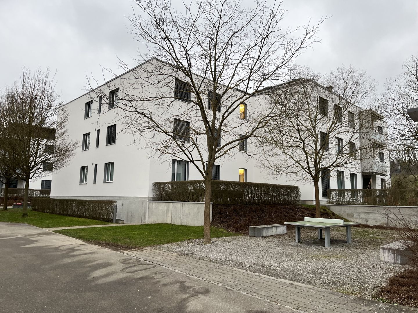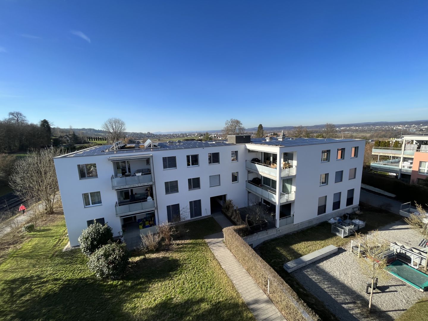 Die Gebäudehüllen der fünf Mehrfamilienhäuser werden gesamthaft überarbeitet. Die Fassaden werden für weitere zehn Jahre ohne nötige Eingriffe instand gestellt. Die Gebäude-Elektrik (MFH`s und Tiefgarage) wird komplett erneuert, die Umgebungsbeleuchtung wird strukturell neu organisiert und gespiesen. Ergänzt wird die Gebäude-Elektroinfrastruktur durch die Vorbereitung einer E-Ladeinfrastruktur, eine Paketfachanlage und mit der Umsetzung einer Photovoltaikanlage auf zwei MFH-Dächern mit ZEV.