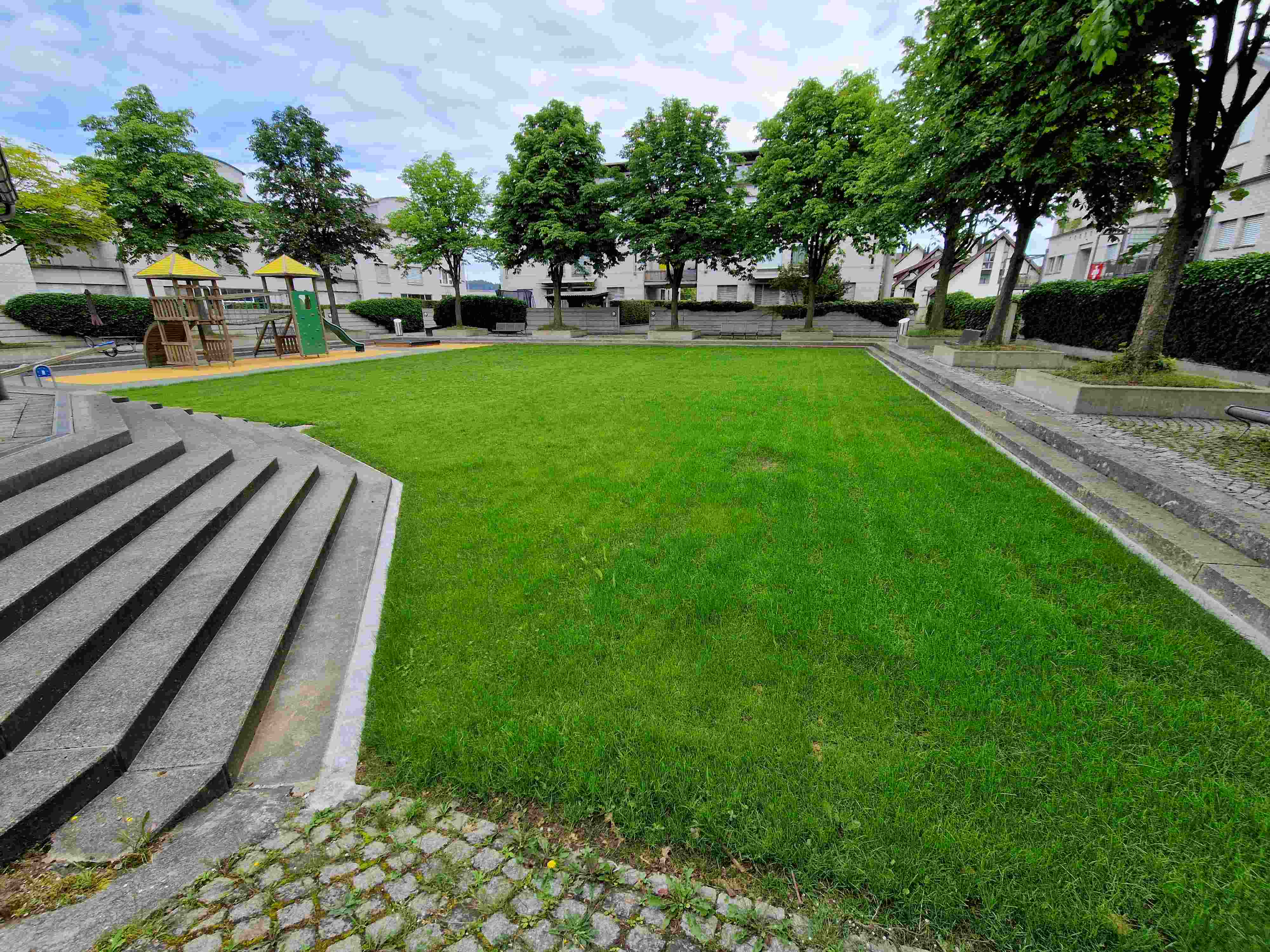 - Spielbereich weist Stolperfallen durch aufstehende Platten auf.