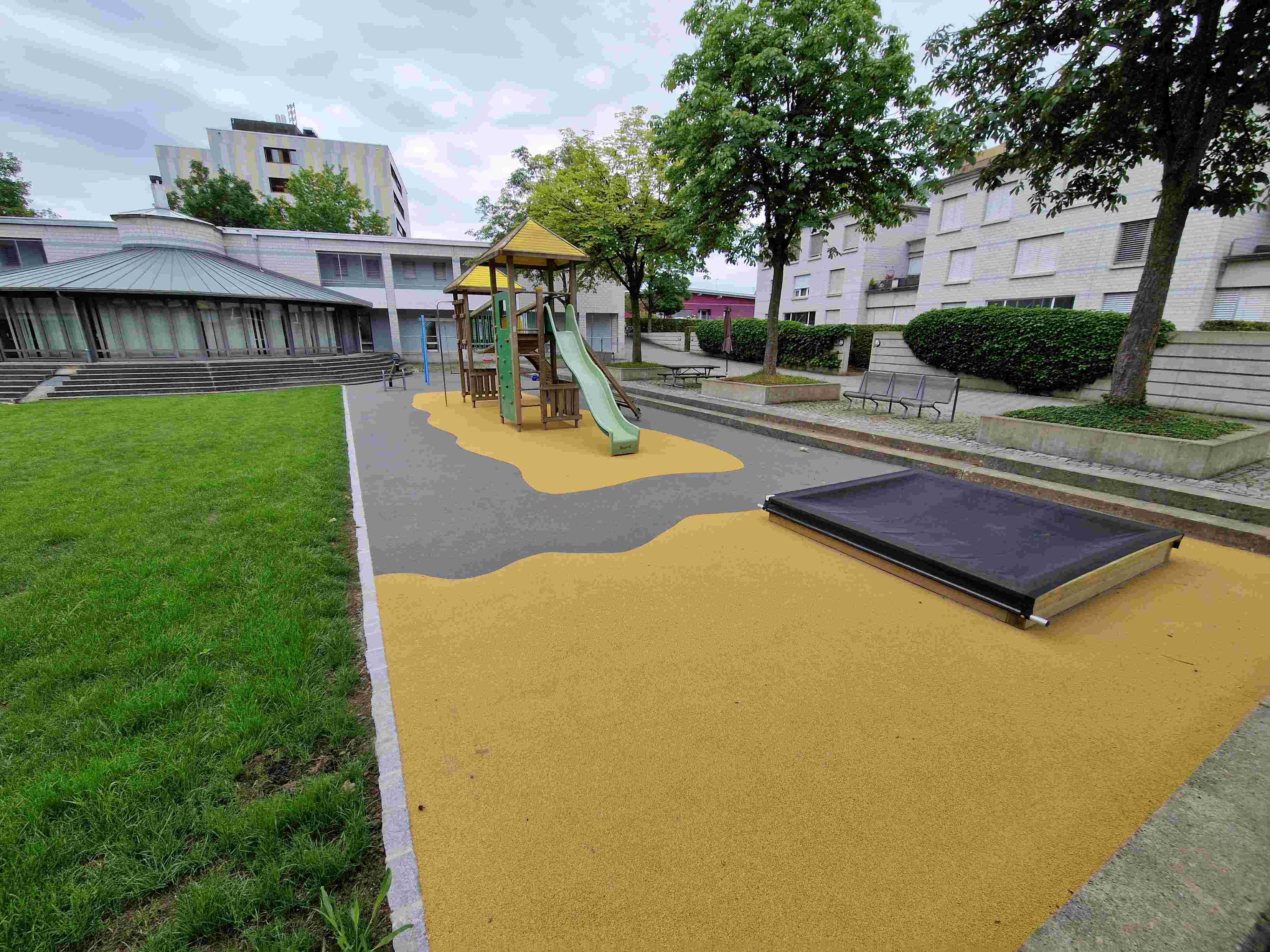 - Neugestaltung der Spielfläche mit fugenlosem Fallschutzbelag zur Unfallprävention.